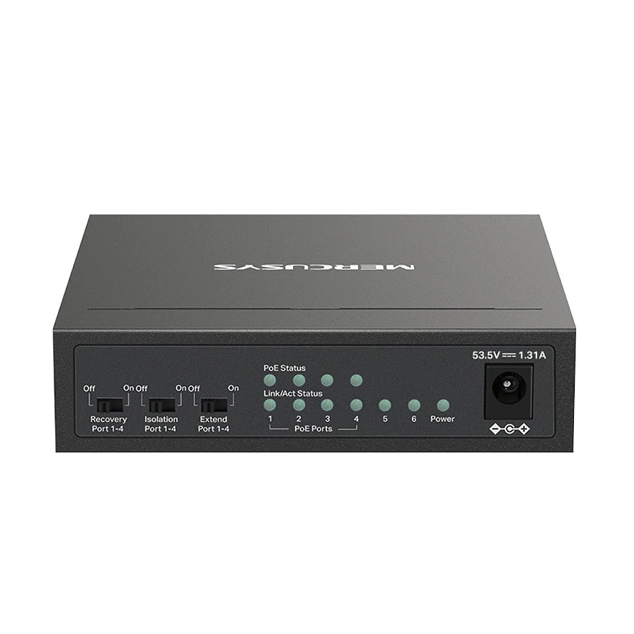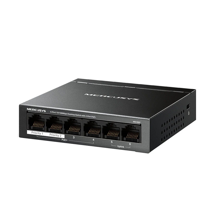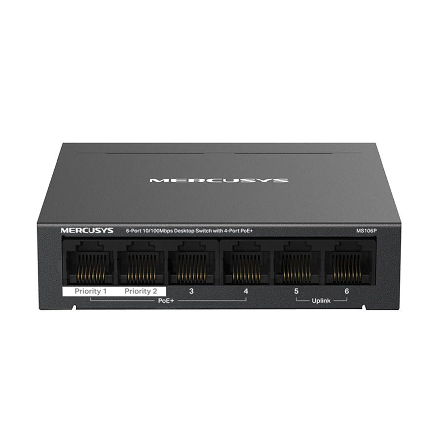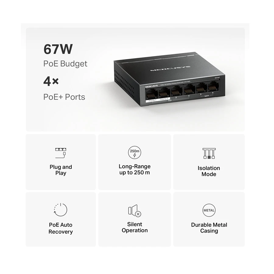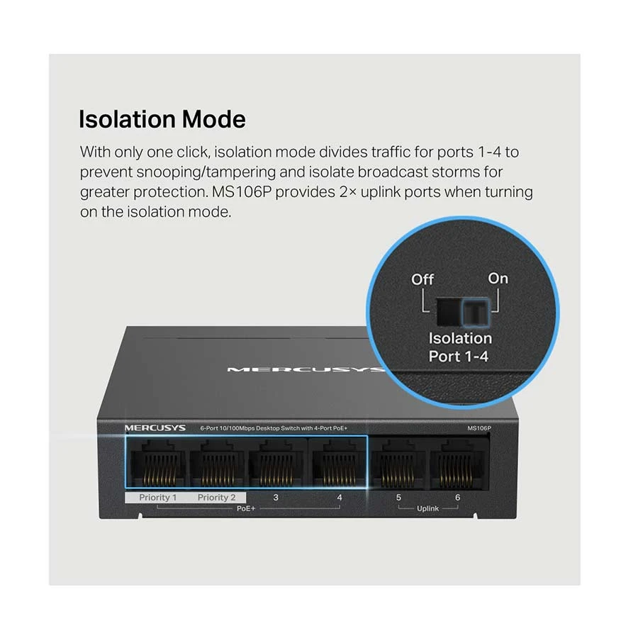 Two Cables in One: With four PoE+ ports, transfers data and power on one single cable. High Power PoE+: Supports PoE Power up to 30 W for each PoE port and 67 W for all PoE ports. 2x Uplink Ports: MS106P provides 2x uplink ports when turning on the isolation mode. One for connecting to the Internet and one for connecting to the NVR.Long-Range up to 250 m: Increases PoE transmission distance to 250 m by Extend Mode. PoE Auto Recovery: Automatically reboots your dropped or unresponsive PoE-powered devices. Isolation Mode: One click to divide traffic for specific ports for stability and securi. Compliant with Powered Devices: Works with IEEE 802.3af/at compliant PDs. Plug and Play: Simple to use, saving time and effort. Durable Metal Casing: Allows for efficient heat dissipation and long network life. Silent Operation, No Fuss, Cost-Efficiency, Flexibility, Power Management, IEEE 802.3af/at, Traffic Separation, Port Prioritization.