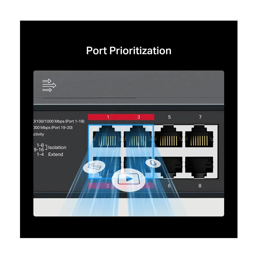 Full Gigabit Ports: 16x Gigabit PoE+ ports, 2x Gigabit non-PoE ports, and 2x Gigabit SFP slots. High Power PoE+: Support PoE Power up to 30 W for each PoE port and 192 W for all PoE ports. Working with IEEE 802.3af/at compliant PDs. Long-Range up to 250 m: Increases PoE transmission distance to 250 m by Extend Mode. Isolation Mode: One click to divide traffic for specific ports for stability and security. Priority Mode: Guarantees the quality of sensitive applications like video monitor. Plug and Play: No configuration or central management required. PoE Auto Recovery: Automatically reboots your dropped or unresponsive PoE-powered devices.