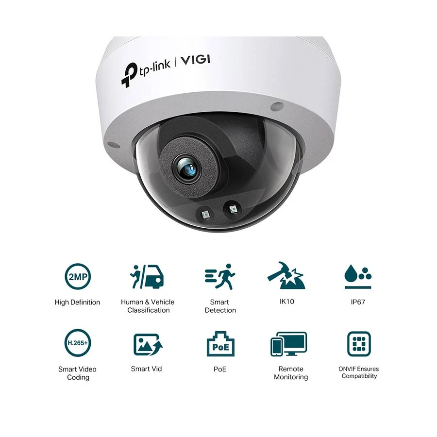 Client: VIGI App, VIGI Security Manager, VIGI NVR, Web Browser: Network, Cloud, Smart Event: Human & Vehicle Classification, Area Intrusion Detection, Line-Crossing Detection, People Detection, Vehicle Detection, Region Entering Detection, Region Exiting Detection, Object Abandoned Detection, Object Removal Detection, Basic Event: Motion Detection, Video Tampering Detection, Exception ( Illegal Login), Alarm Linkage: Message Push, Image Settings: Mirror, Brightness, Contrast, Saturation, Sharpness, Exposure, WDR, White Balance Adjustable by Client Software, Rotation(90 Degree/270 Degree), 2MP Full-High Definition: The VIGI C220I camera comes with 2MP – more than enough pixels to pick up some of the more discrete details. Human & Vehicle Classification: Distinguishes humans and vehicles from other objects, so you receive more accurate event notifications. Smart Detection: Receive notifications and check feeds when someone crosses a boundary, enters an area you`ve set, obstructs the camera, or removes/abandons objects. IK10 Vandal-Proof & IP67 Waterproof: With vandal-resistant, rugged housing and waterproof design.