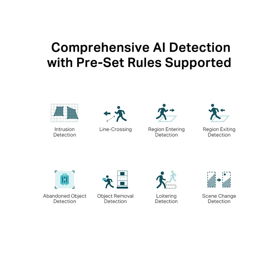 Image Parameters Switch, Up to 4 Privacy Masks, ONVIF, Client: VIGI App, VIGI Security Manager, VIGI NVR, Web, Web Browser: Google Chrome 57 and above, Firefox 52 and above, Safari 11 and above Microsoft Edge 91 and above, Network Storage: NAS (NFS, SMB/ CIFS), Smart Event: Human & Vehicle Classification, Area Intrusion Detection, Line-Crossing Detection, People Detection, Vehicle Detection, Region Entering Detection, Region Exiting Detection, Object Abandoned Detection, Object Removal Detection, Loitering Detection, Memory Card Video Recording, Message Push, Audible Warning, White Light Flashing, Search and filter to people or vehicle of interest based on many different attributes, making post-event search faster and easier. Supports Simultaneous Detection and Capture of Human Body and Vehicle. 5MP Super-High Definition. 24h Full-Color. Active Defense. Corridor Mode. PoE/12V DC. Flexible Management and Storage. Smart Detection. Smart Video Coding. SmartVid.